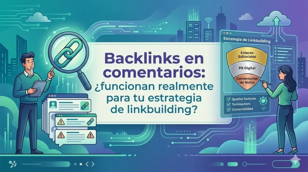 Ilustración horizontal en tonos fríos de dos expertos analizando la jerarquía del linkbuilding (enlaces editoriales, PR digital y comentarios de nicho) bajo la pregunta "¿Funcionan los backlinks en comentarios?"