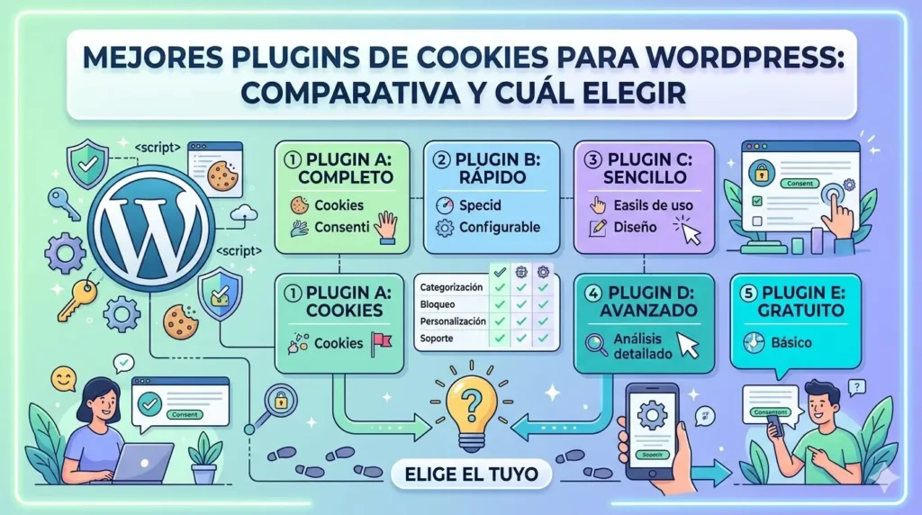 En esta guía encontrarás una comparativa honesta de los 5 mejores gestores de cookies para WordPress, con sus ventajas, inconvenientes, precio y para qué tipo de web encaja mejor cada uno. Sin relleno: solo lo que necesitas para decidir bien.